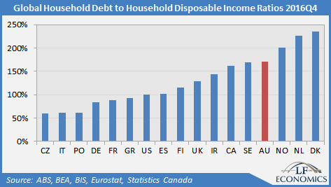 While the focus of household debt is in relation to GDP, household income is more accurate. Interestingly, all nations toward the higher end either have or had housing bubbles. In Australia’s case, this is unsurprising, given it currently has the world’s 2nd highest household debt to GDP ratio, the 3rd highest debt service ratio (DSR; measuring aggregate debt payments to income) and 4th highest debt to income ratio.
