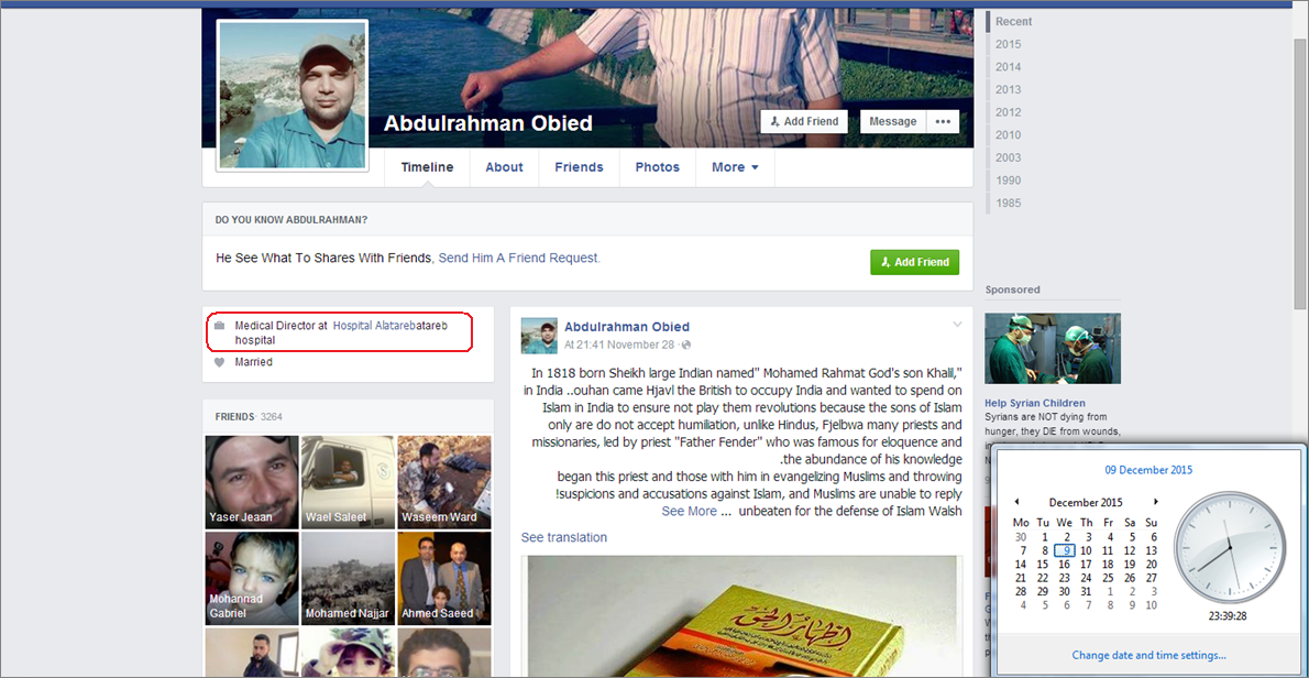 Atareb Hospital’s self-proclaimed, Medical Director, Abdulrahman Obied, was filmed alongside Dr Rola Hallam.In a blog article, Stuart showed that Abdulrahman’s younger brother, Iessa Obied, posted on Facebook numerous images of himself posing with an array of weapons.