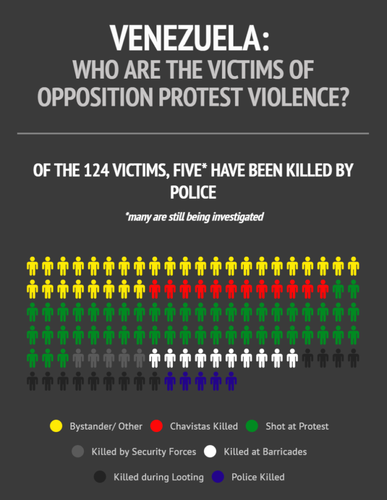 Telesur English has been keeping a running tally of deaths. So far there have been well over a hundred – and 80% or more have been from opposition violence – a female national guard officer shot in the throat by snipers, people set on fire [warning: graphic video] for supporting the President, a lot shooting at the police and military, along with random shootings of civilians. There have been at least two roadside bombs targeting police convoys.