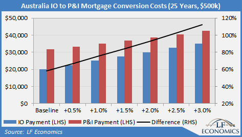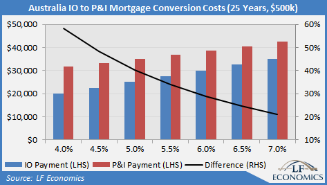 With interest-only loans of 25% for owner-occupiers, 66% for investors and 39% in total, relative to the stock of total mortgage debt, conversion would present risks to overleveraged borrowers, even if the interest rate on P&I loans are slightly lower than for IO loans.