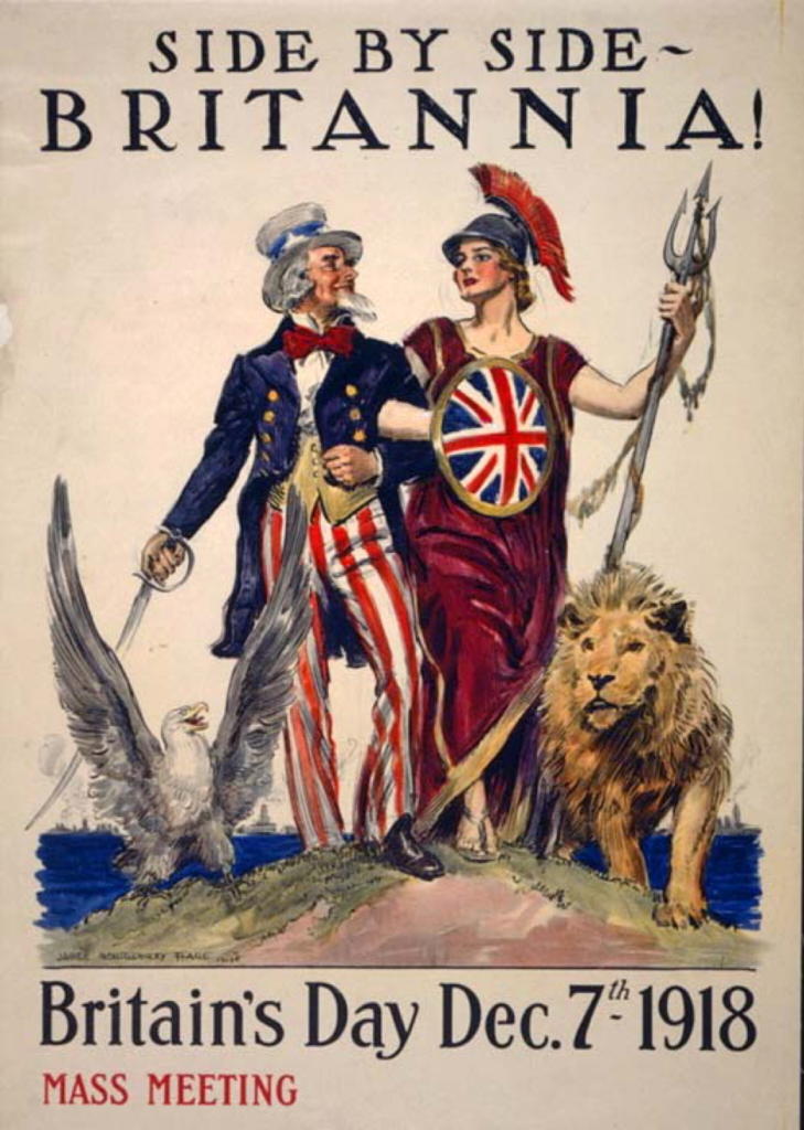 I don't think this needs much elaboration. The baton was passed, a point conceded by the British Propaganda of the time. After 178 years of "Rule Britannia, Britannia rules the waves" the UK now portrayed itself arm-in-arm with the new kid on the block 'Uncle Sam':