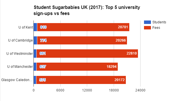 We analysed the data of the top 5 universities in the UK with most number of active sugarbabies, against the tuition costs of attending those universities and found a steady increment, showing the direct correlation between rising student debt in the UK due to austerity, and growth in the sugar market.
