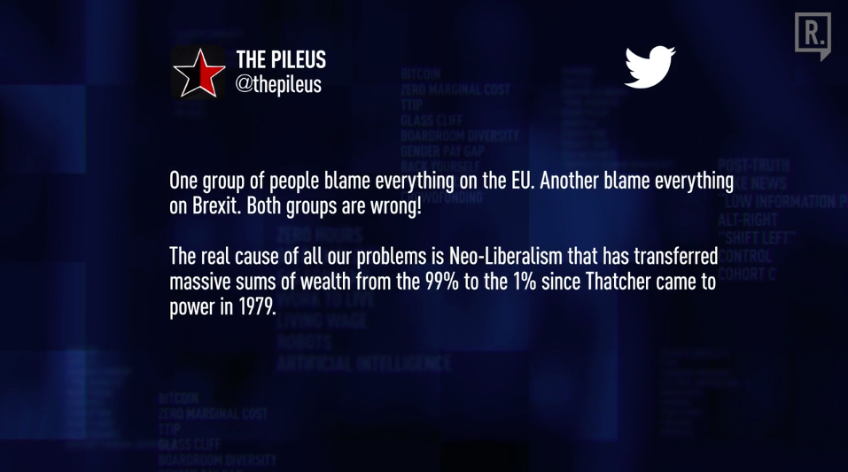 “In the 1970s workers didn’t necessarily understand the internal mechanics of companies and so on. But they understood the basic structures of capitalism and that the boss was their enemy and so on, because the labour movement provided them with those tools to make sense of the world. Nowadays because the left has abandoned those communities, they’re left without those framing devices. So they know that they’re hurting. They know that they are facing low wages, crap jobs, poor housing, competition for public services, long queues at the doctors and so on. And they don’t have any framework to make sense of that. But the right offers them a framework to understand that.