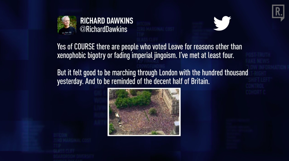 Richard Dawkins recently tweeted: “Yes of course there are people who voted leave for reasons other than xenophobia bigotry. A fading imperial jingoism. I’ve met at least four but it felt good to be marching through London with the hundred thousand yesterday and to be reminded of the decent half of Britain.”