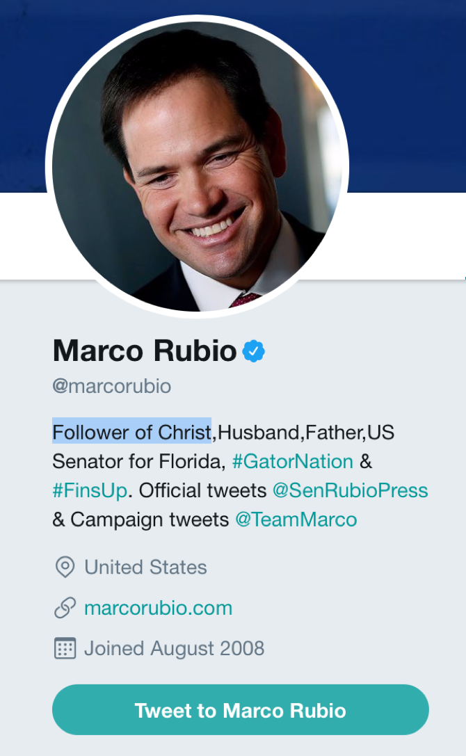 On Rubio’s Twitter profile, he describes himself as a ‘follower of Christ’: