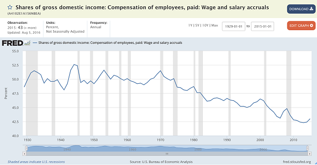 Shares of gross domestic income in the US dropped from 52.6% in 1929 to 42% in 2015, according to economic research by the Federal Reserve Bank of St Louis.
